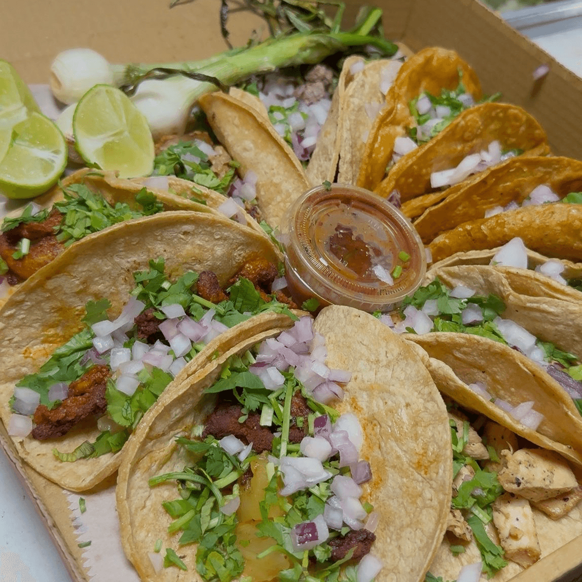 12 tacos loaded with flavor, featuring 4 delicious meats (3 tacos of each protein). Accompanied with pico de gallo, lime & salsa.