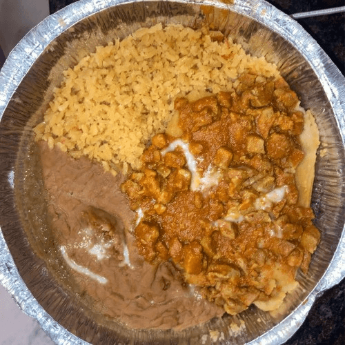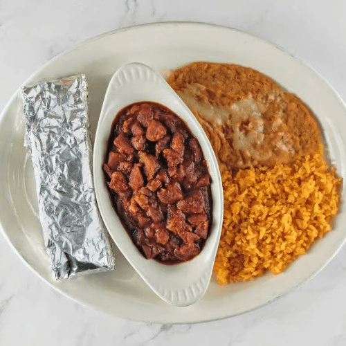 Served with rice, beans & flour or corn tortillas, small pieces of pork slowly cooked in our special colorado sauce