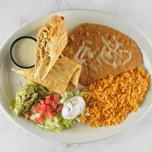 Golden brown deep fried burrito served with your choice of protein served with rice, beans and guacamole salad
