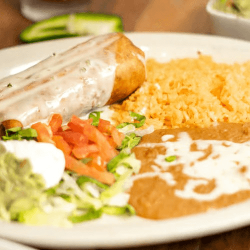 One flour tortilla rolled with ground beef & beans, topped with cheese & red sauce. Served with lettuce, guacamole, sour cream & tomatoes