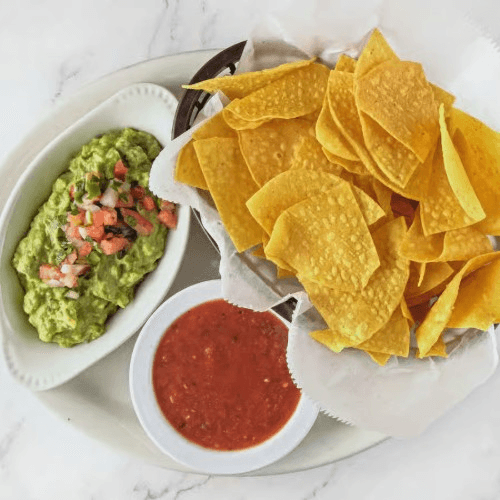 Crispy fried corn tortilla served with beans. Topped with lettuce, tomato guacamole and shredded Monterrey Jack cheese