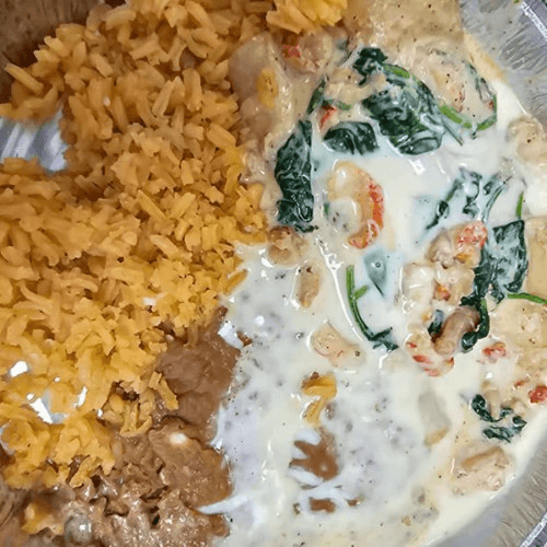 Shrimp, crawfish, crab and baby spinach sautéed in a creamy seafood sauce, served with rice & refried beans. Consuming raw or uncooked meat, poultry, seafood, shellfish or eggs may increase risk of food borne illness, especially if you have certain medical conditions. We are not responsible for an individual’s allergic reaction to our food or ingredients used in food items.