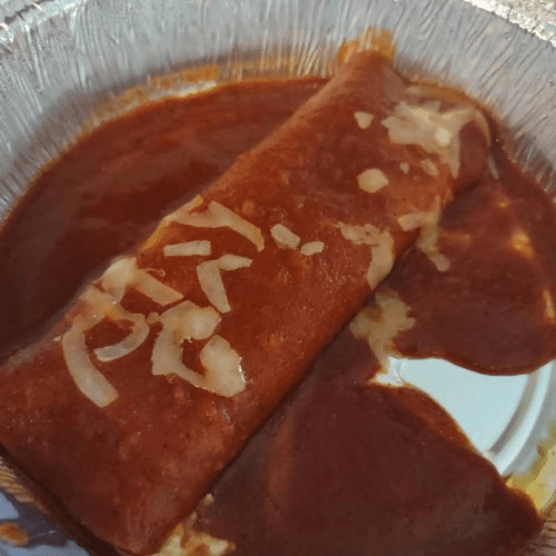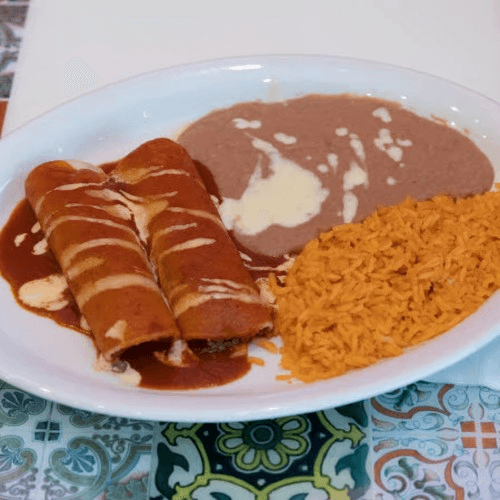 Two beef or chicken enchiladas; served with rice & refried beans, topped with red sauce. Served with traditional red sauce, may substitute for green sauce or cheese sauce.
