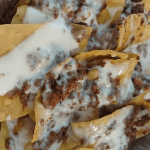 Crispy fried corn tortilla served with beef topped with lettuce, tomato, sour cream and shredded Monterrey Jack cheese