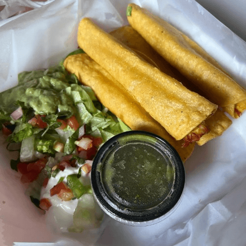 Fried corn tortilla rolled and filled with shredded beef or chicken. Served with a side of guacamole