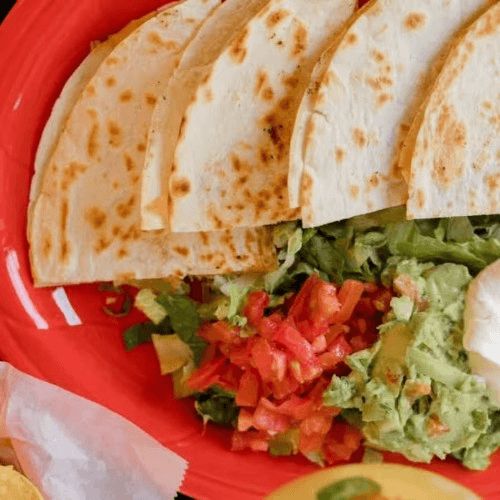Two cheese quesadillas filled with spinach, mushroom, tomato, bell pepper & onion