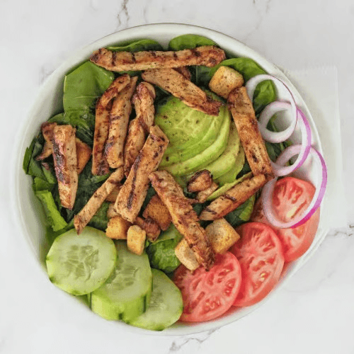 Grilled chicken over romaine lettuce, spinach, avocado, cucumber, tomato & croutons