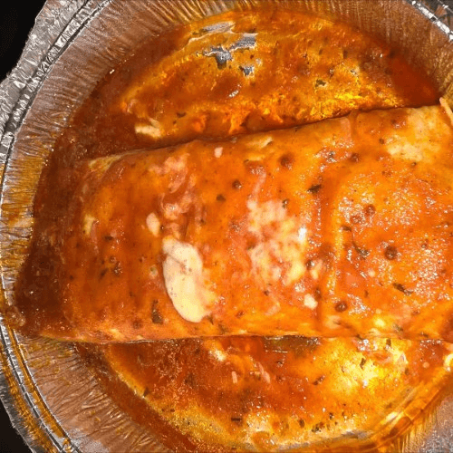 Beef or chicken burrito flour tortilla filled with beans. Topped with red sauce & cheese
