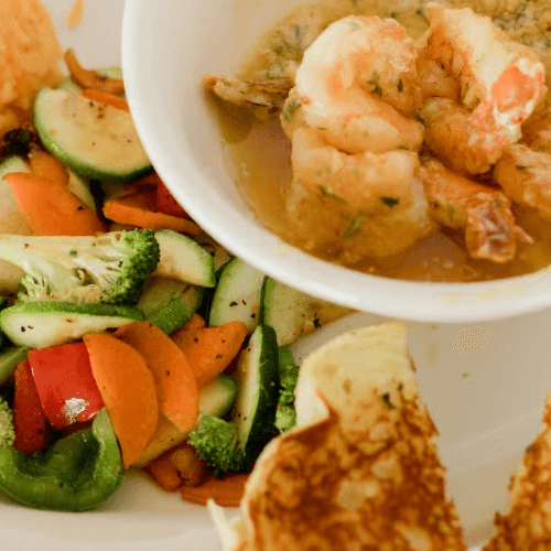Two shrimp served with mexican rice and sautéed vegetables. Consuming raw or uncooked meat, poultry, seafood, shellfish or eggs may increase risk of food borne illness, especially if you have certain medical conditions. We are not responsible for an individual’s allergic reaction to our food or ingredients used in food items. Please be aware that there may be some bones in fish fillets.